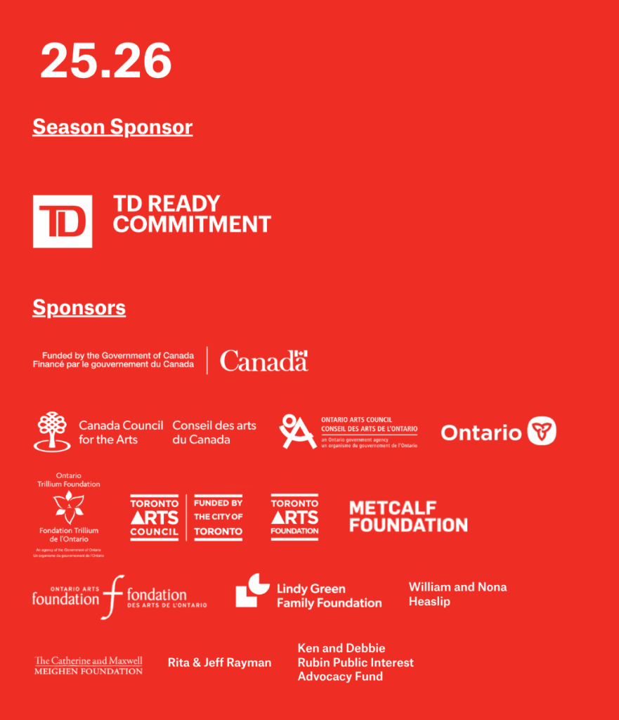 We are so grateful for all of our sponsors, funders, and donors for believing in Theatre Passe Muraille’s mission and supporting our artistic programs— allowing our team to plan ahead with confidence.
