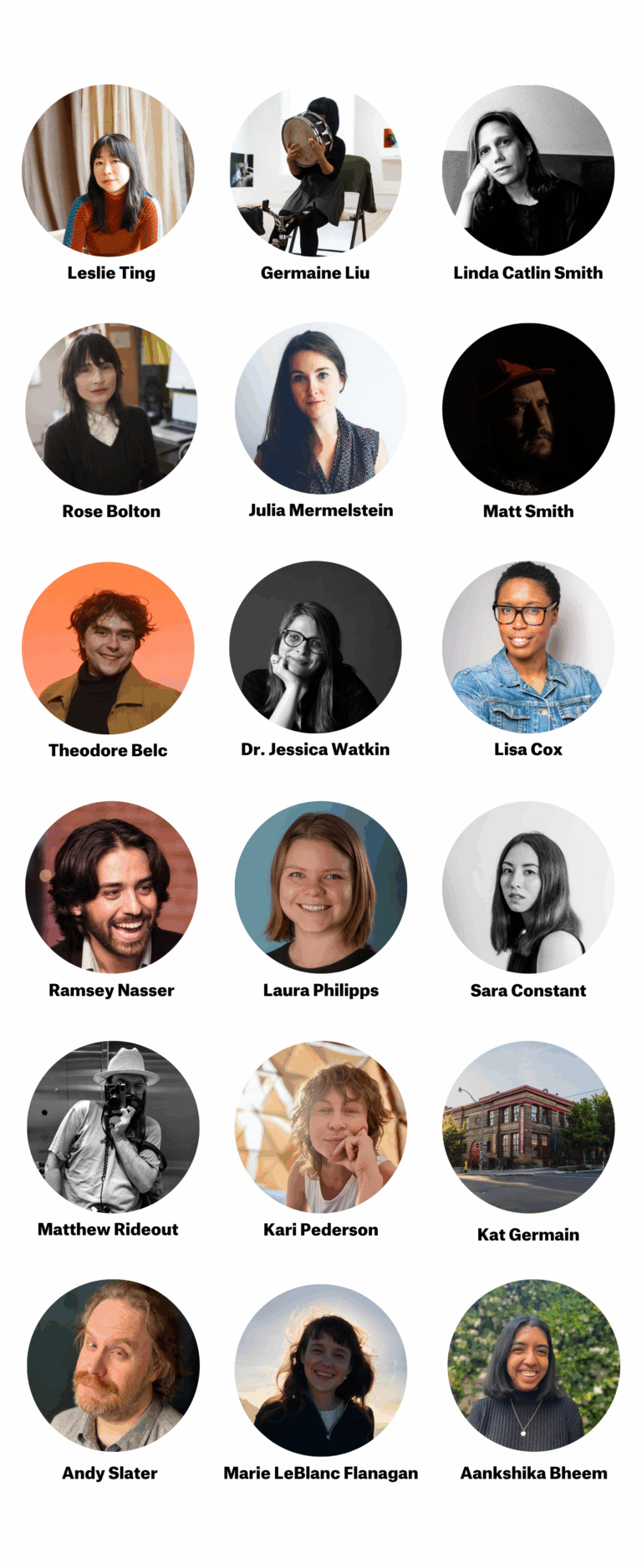 Lorna Craig, Patrick Lynn, Cosette Pin, Wilson Lin, Stephanie Kuse, James Kendal, Rebecca Vandevelde, Darren Creech, Nicole Eun-Ju Bell, Adam Paolozza, Elysha Poirier, Kari Pederson, William Fallon, Deanna Choi, Alex Bulmer, Carol Gimbel, WhyNot’s RISER, Inter/Access, Mark Zurawinski